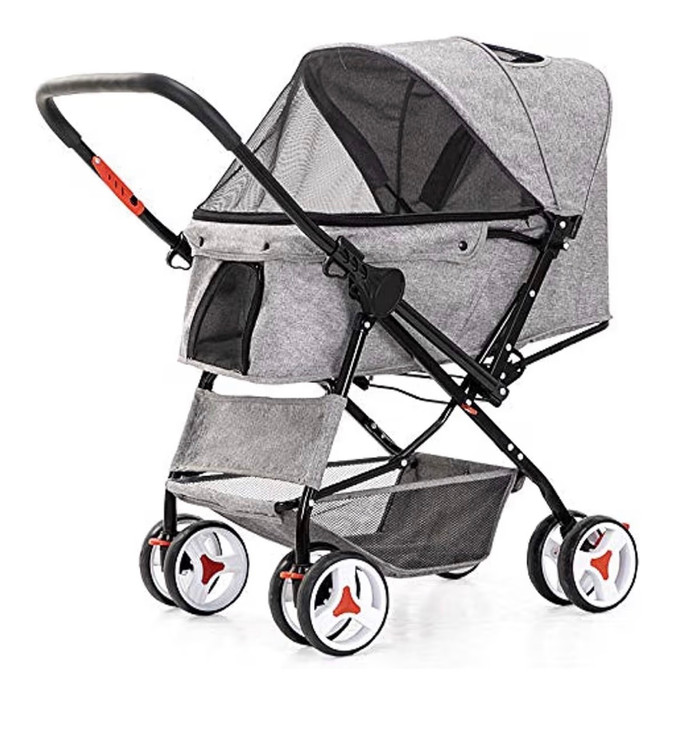 کالسکه قابل حمل و سبک، کالسکه سگ برای سگهای متوسط، کالسکههای چهار چرخ گربه/سگ، تاشو آسان با یک دست، کالسکه حمل توله سگ و بچه گربه با دسته فشاری برگشتپذیر (خاکستری)