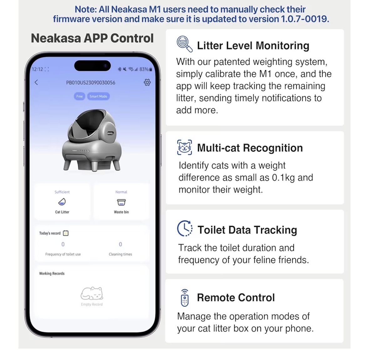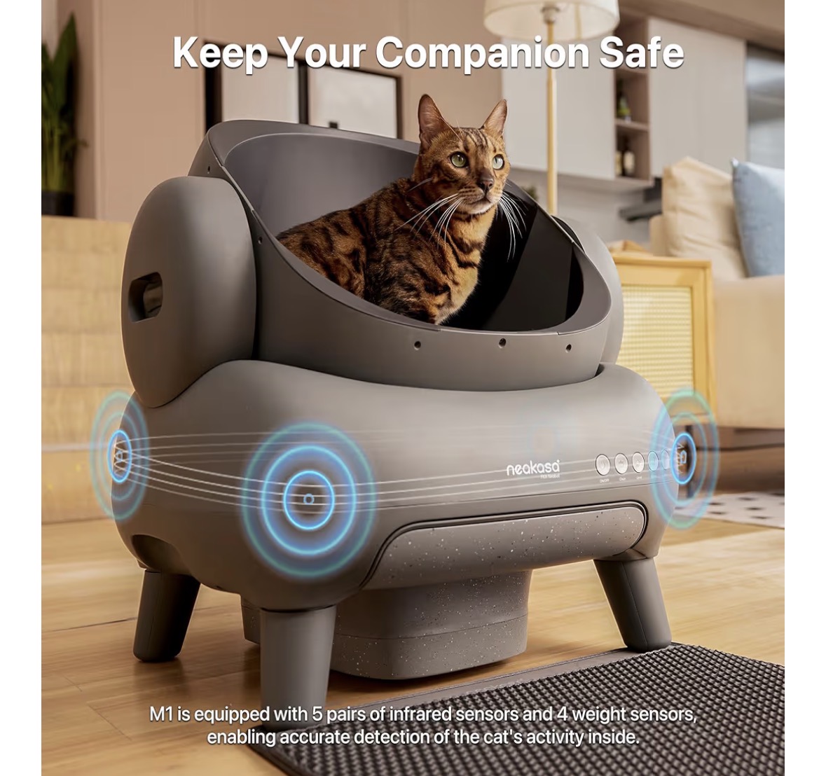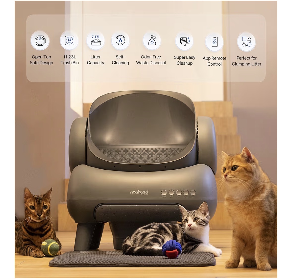 ظرف خاک گربه Neakasa M1 روباز و خود تمیز شونده، ظرف خاک گربه اتوماتیک با کنترل از طریق اپلیکیشن، دفع زباله بدون بو شامل کیسههای زباله دارای یوی و عطر افشانی خودکار و مناسب برای اموزش ادرار