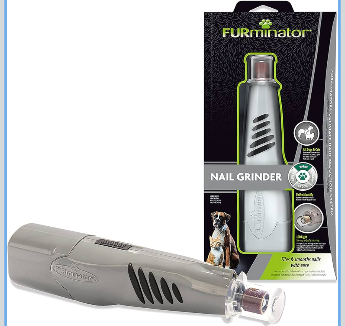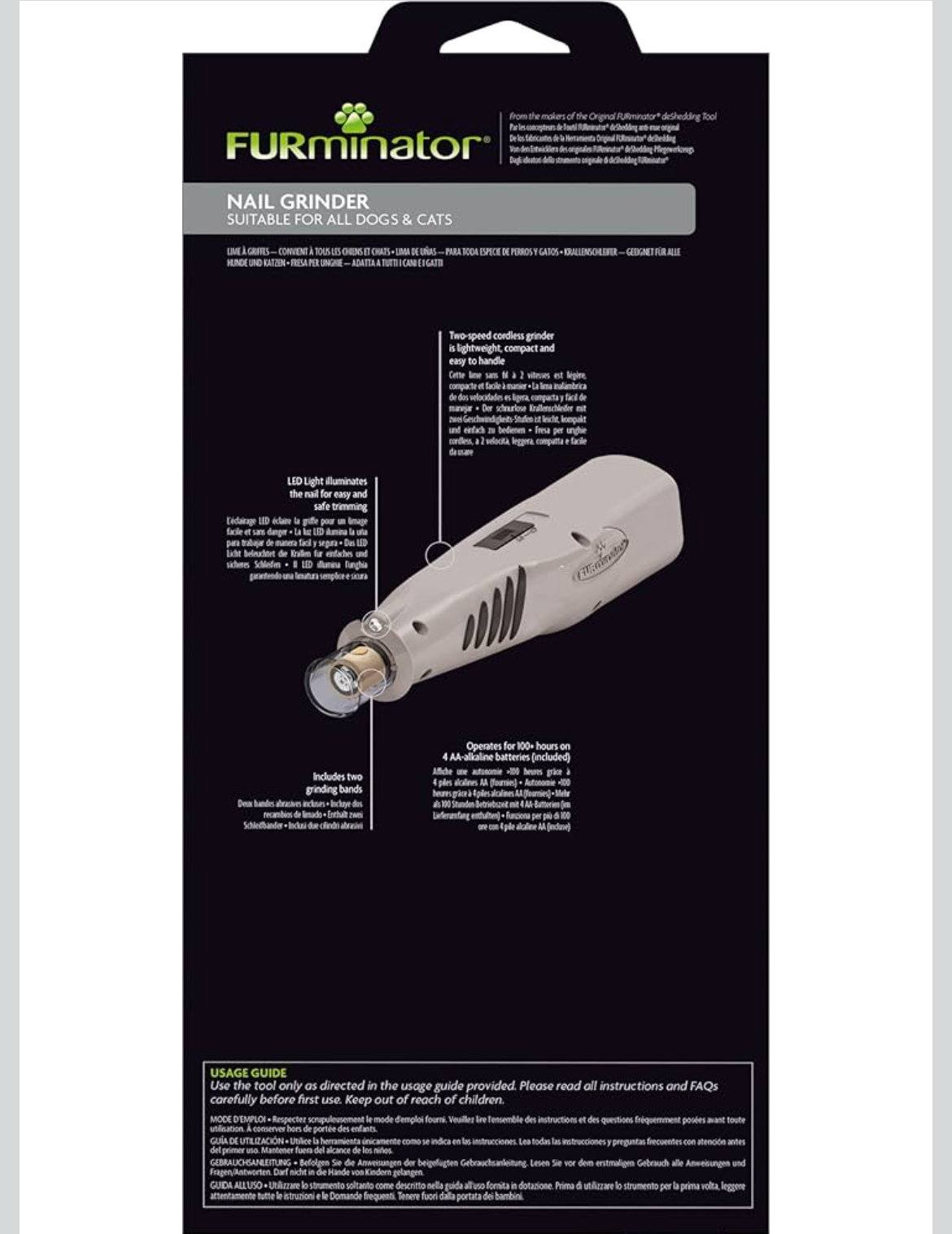 سوهان ناخن حرفهای دو سرعته FURminator® شامل دستورالعملهای دقیق، ۴ باتری قلمی قلیایی و ۲ نوار سوهان.