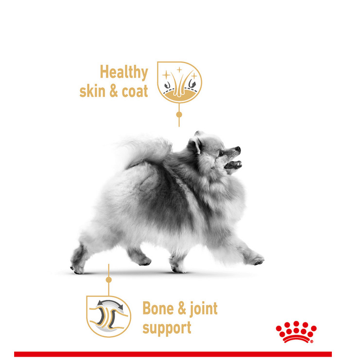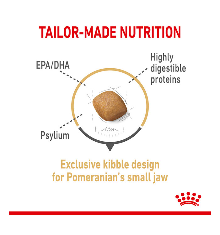 با دانه بندی ویژه برای کمک به حفظ سلامت دندان ها : این غذا حاوی کلسیم کلاتور است. طراحی دانه های آن نیز به گونه ای انجام شده که سگ های پامرانین به خوبی آن را بجوند. به این ترتیب عملکردی مشابه با مسواک زدن دندان ها ایجاد خواهد شد.