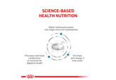 غذای سگ ضد آلرژی رویال کنین حاوی امگا ۳، EPA/DHA است که به حفظ سلامت پوست و کت سگ شما و همچنین سیستم گوارش آنها کمک می کند. ترکیب کامل غذا به گونه ای است که سلامت پوست و کیفیت مو را بهبود می بخشد. بدون گلوتن و لاکتوز است و به حفظ فلور طبیعی سیستم گوارش کمک می کند.