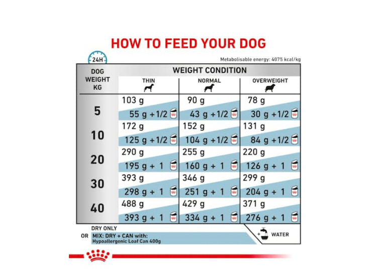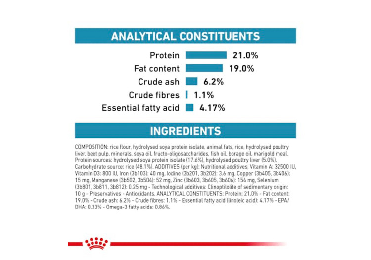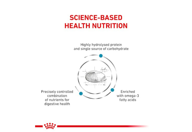 غذای سگ هایپوآلرژنیک رویال کنین برای درمان آلرژی غذایی ساخته شده است و به بهبود سلامت پوست و پوشش کمک می کند. این محصول یک ماده غذایی ضد حساسیت و درمانی است و برای سگ هایی که علائم آلرژیک مانند قرمزی و سوزش پوست، اسهال و استفراغ یا عفونت های مکرر گوش با تجویز دامپزشک دارند قابل استفاده است. پروتئین هیدرولیز شده سویا در ترکیب آن به راحتی جذب می شود و ایجاد حساسیت نمی کند.