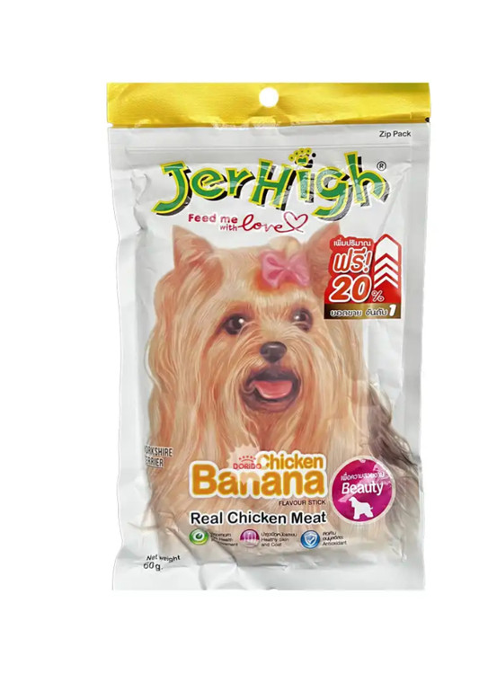 تشویقی سگ جرهای با طعم مرغ و موز مدل Jerhigh Chicken with Banana یکی از مقوی ترین و مفیدترین تشویقی است که حاوی ویتامین ها و املاح معدنی بسیاری است که هر کدام از آنها به سلامت دوچندان سگ شما، کمک می کنند. این ماده غذایی حاوی مقادیر مناسب امگا ۳ است که به سلامت قلب و عروق کمک کرده و از ابتلای سگ به عارضه های قلبی جلوگیری می نماید.