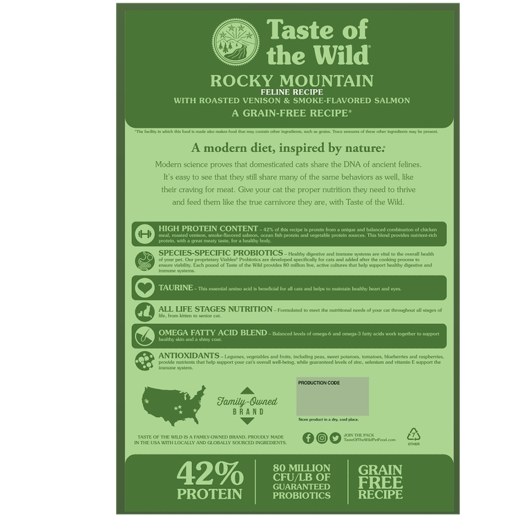 غذای خشک گربه تیست اف د وایلد مدل Rocky Mountain با طعم گوشت گوزن برشته شده و ماهی قزل آلا دودی