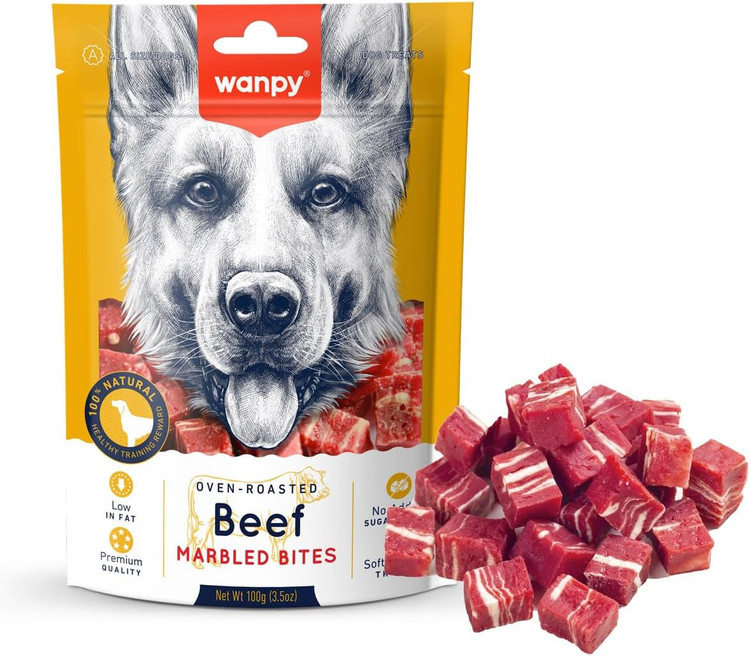 غذای Wanpy Beef Marbled Bites شبیه یک برش منظم از گوشت گاو در مکعب های کوچک برای دقیقا یک لقمه است.