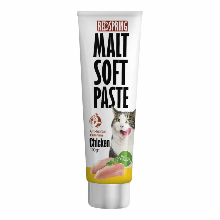 خمیر مالت با طعم مرغ گربه بسیار دوست داشتنی و لذیذ از برند محبوب رد اسپرینگ با اثر گذاری قوی، ضد گلوله ی مویی است. سلولز موجود در ان پیشگیری کننده از تشکیل گلوله مویی و مالت طبیعی موجود در آن با تقویت ترشحات مخاطی دافع گلوله های مویی از سیستم گوارش گربه ها است.