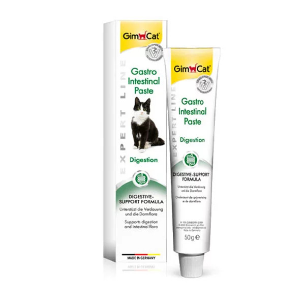 خمیر پروبیوتیک گسترو مخصوص تنظیم فلور روده جیم کت (GimCat) آنچه را که در یک دستگاه روده سالم اتفاق می افتد تنظیم می کنند. فیبرهای محلول تنظیم کننده روده از پوسته پسیلیوم موجود در خمیر روده گاسترو (Gastro Intestinal Paste) و همچنین پری بیوتیک ، فلور روده سالم را ارتقا می دهند. ترکیبی از پوست درخت نارون، علف خشک و بتا گلوکان به هضم غذا و فعالیت روده کمک می کند. عملکرد هضم و سیستم گوارش به سلامت عمومی گربه کمک می کند. عملکرد این خمیر همانند غذای گاسترو است. وزن خمیر 50 گرم و تولید کشور آلمان است.